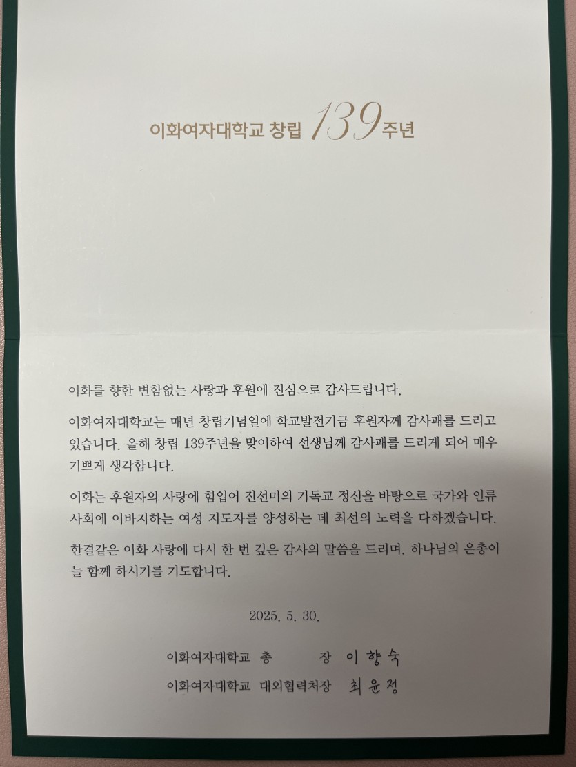 창립 139주년을 맞아 감사패와 인사장을 보내주신 이화여자대학교에 감사를 드립니다.