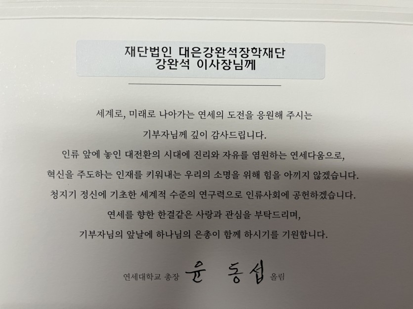 감사인사 ◆ 연세대학교 장학기금 감사 인사장 ◆